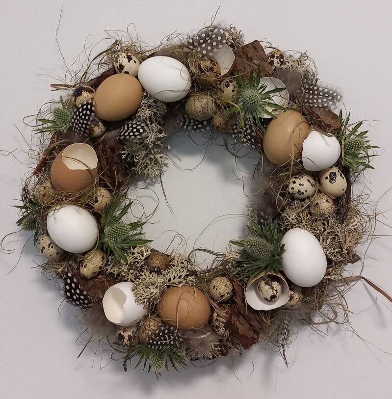 Paaskrans is gemaakt op een strokrans met materialen en bloemen die indrogen. Lang houdbaar!