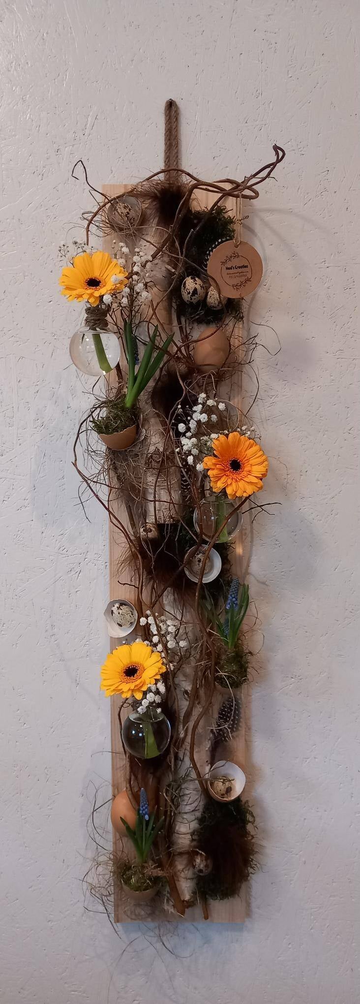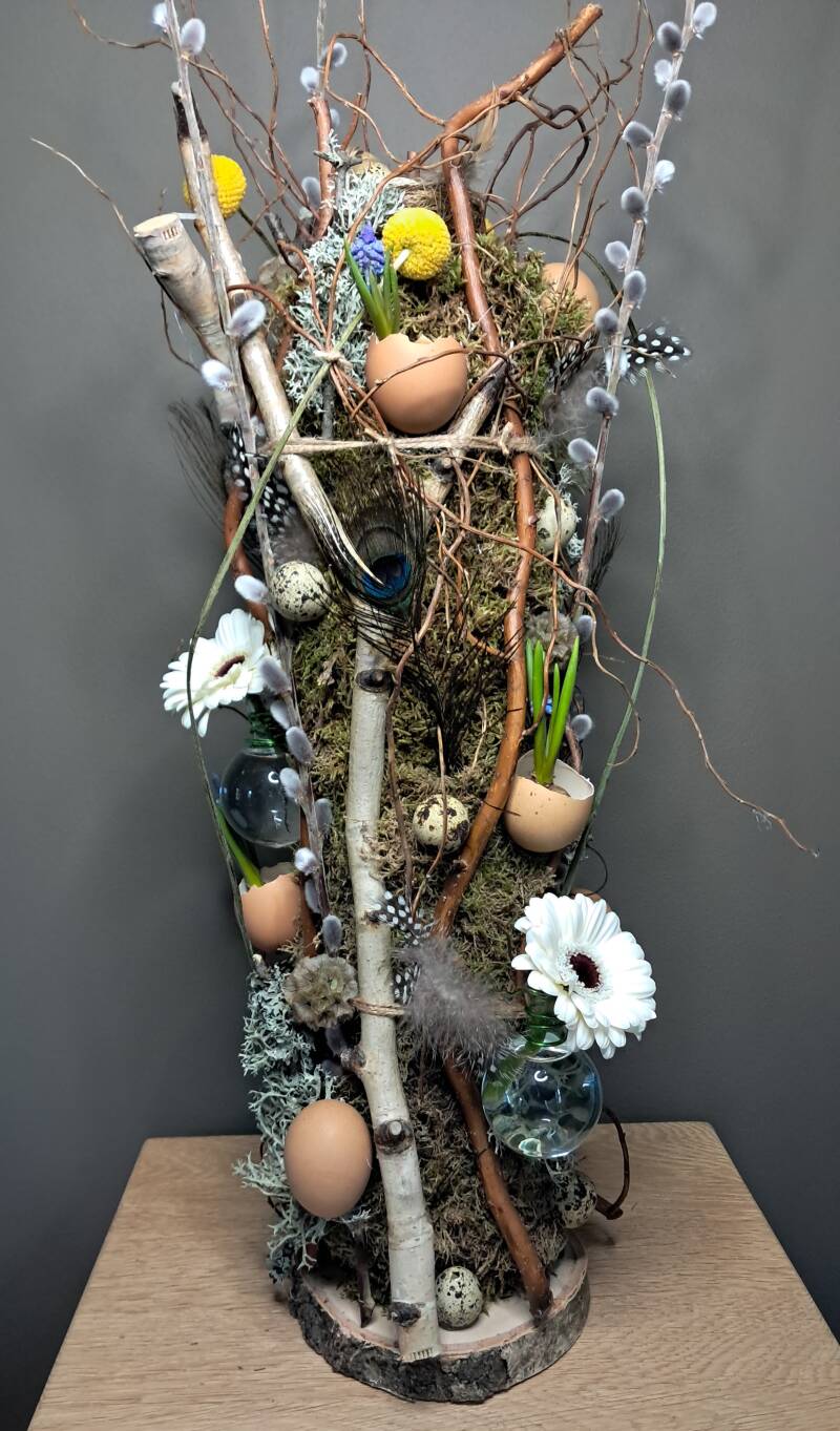 Je gaat een kartonnen koker beplakken met mos en daarom heen takken binden. Daarna de toren versieren met paasdecoratie en je hangt er 3 bolflesjes aan waarin een Gerbera komt. De hoogte is ongeveer 70 cm.